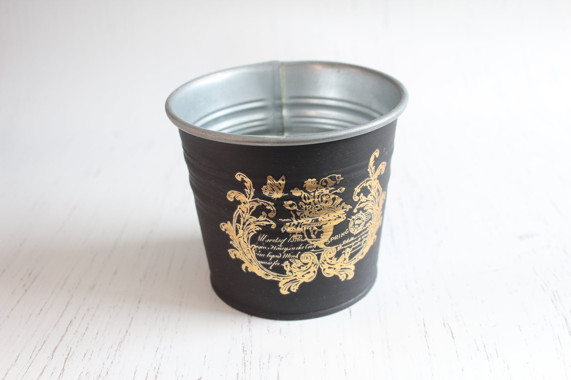 Vintage Black & Gold Tin - Hand-Painted Planter with IOD Transfer